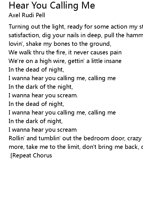 Turning out the light, ready for some action my stick of dynamite, high level satisfaction, dig your nails in deep, pull the hammer down, give all your lovin', shake my bones to the ground, |
