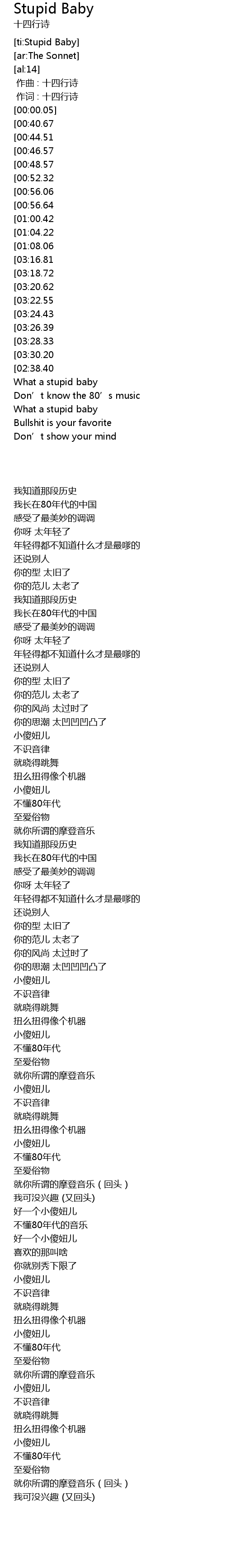 | [03:32.20][03:16.81][02:23.08][02:07.68][01:11.99] | Stupid baby |