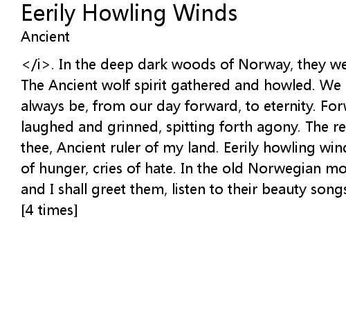 </i>. In the deep dark woods of Norway, they were nowhere to be found. The Ancient wolf spirit gathered and howled. We are the true pagans, we shall always be, from our day forward, to eternity. Forward in the forest, the old man laughed and grinned, spitting forth agony. The red full moon. This is my ode to thee, Ancient ruler of my land. Eerily howling winds, hear the wolves cry. Cries of hunger, cries of hate. In the old Norwegian moon, I will see their red eyes, and I shall greet them, listen to their beauty songs. Eerily, howlings winds |