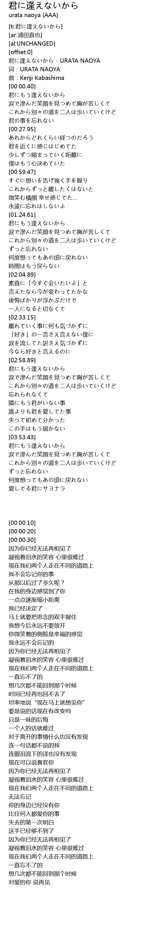 | [00:00.10] | 君に逢えないから - URATA NAOYA |