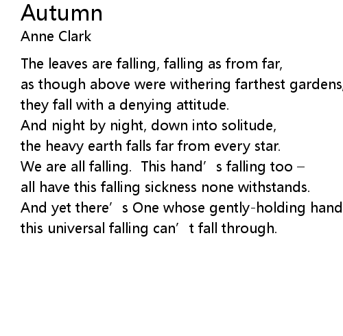 | [00:17.20] | The leaves are falling, falling as from far, |