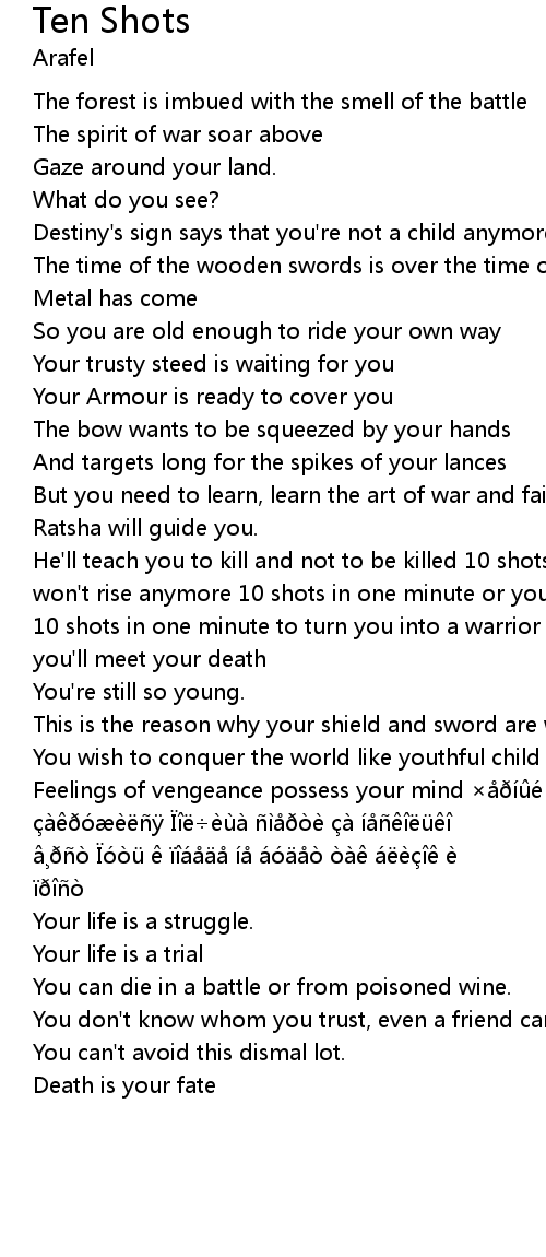 | He'll teach you to kill and not to be killed 10 shots in one minute or the sun won't rise anymore 10 shots in one minute or your people forever will be slaves 10 shots in one minute to turn you into a warrior 10 shots in one minute or you'll meet your death | |