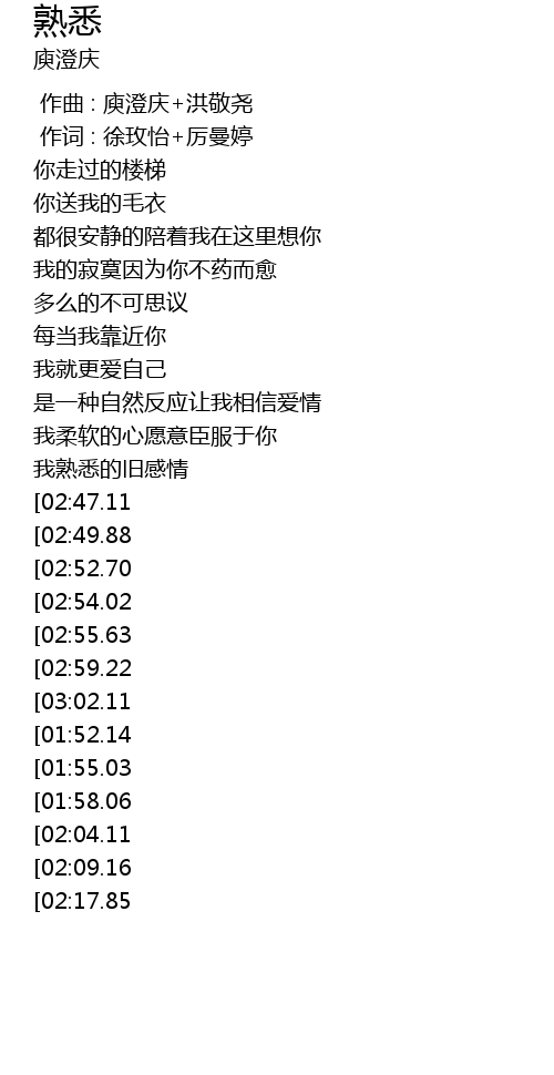 | [03:58.86][02:09.16] | 我熟悉的旧感情 |