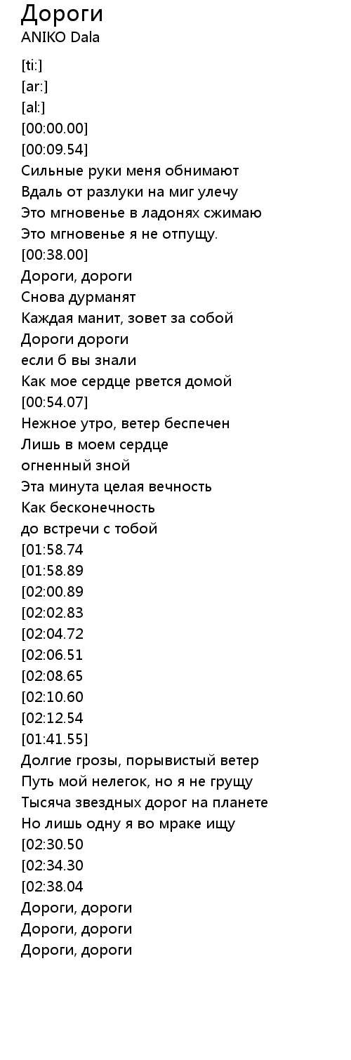 | [02:22.25][02:06.51][01:33.09][01:17.39] | Дороги дороги |