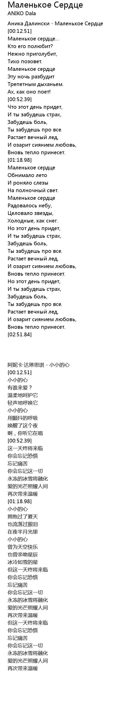 | [00:05.60] | Аника Далински - Маленькое Сердце |