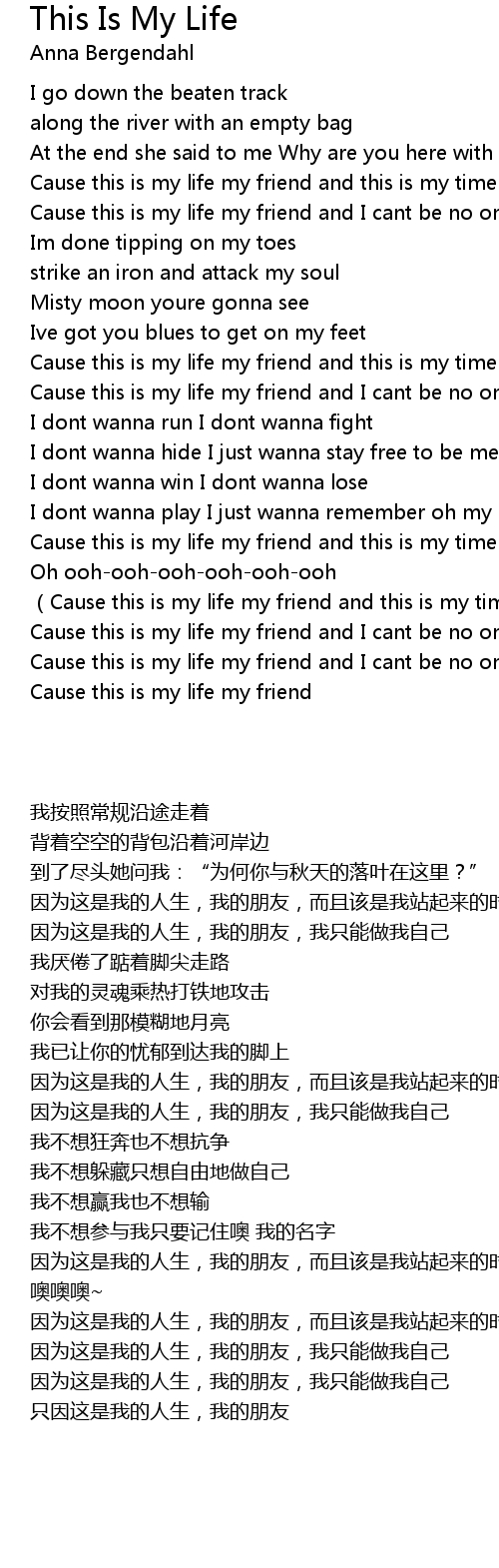 | [00:40.50] | Cause this is my life my friend and I cant be no one else |