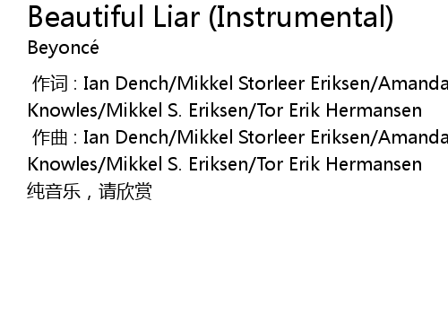 | [00:01.000] | zuò qǔ : Ian Dench Mikkel Storleer Eriksen Amanda Ghost Beyoncé Knowles Mikkel S. Eriksen Tor Erik Hermansen |