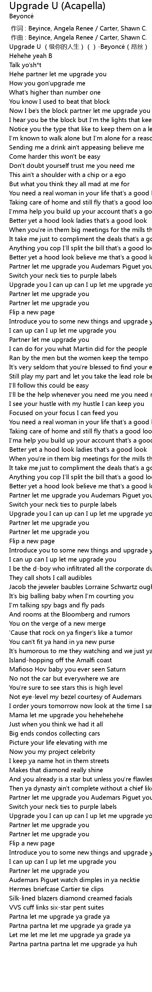| [00:00.00] | Upgrade U (级你的人生)()-Beyoncé(昂丝) |