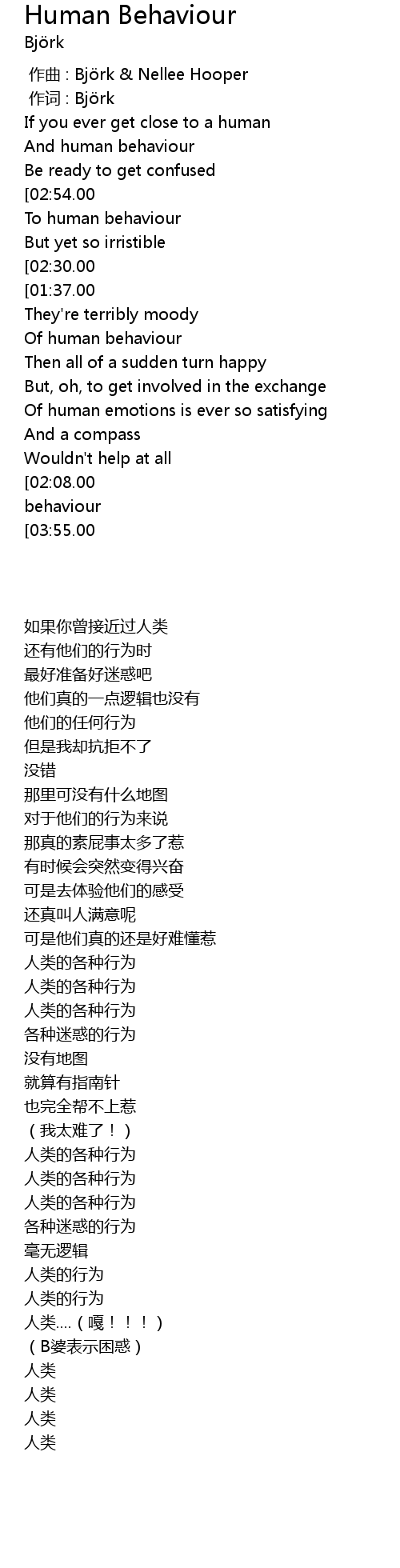 | [02:04.00][02:08.00][02:13.00][02:17.00][02:39.00][02:43.00][02:48.00][02:52.00][02:57.00][03:01.00][03:05.00] | Human behaviour |