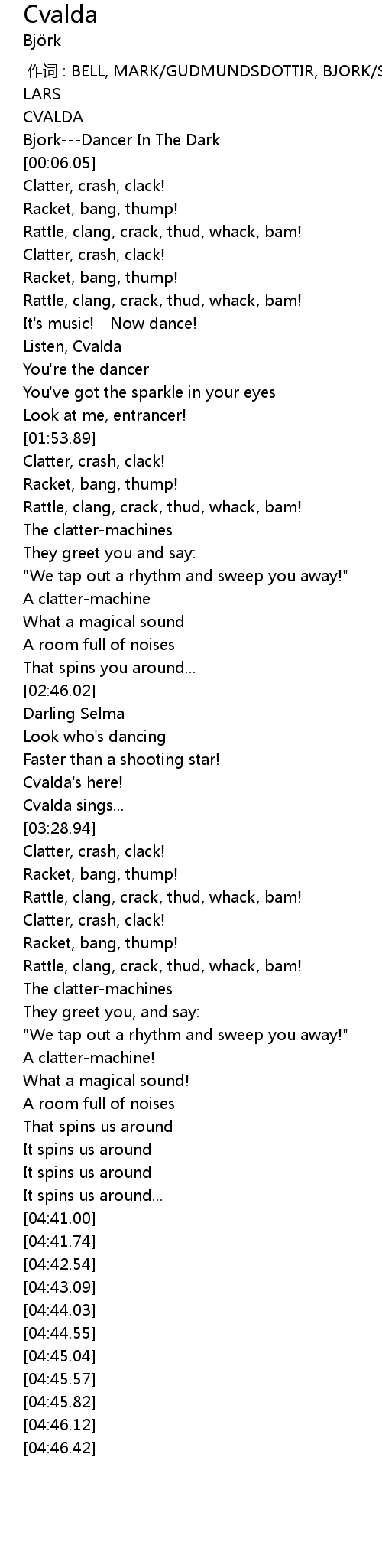 | [00:00.00] | 作词 : BELL, MARK/GUDMUNDSDOTTIR, BJORK/SIGURDSSON, SJON/VON TRIER, LARS |