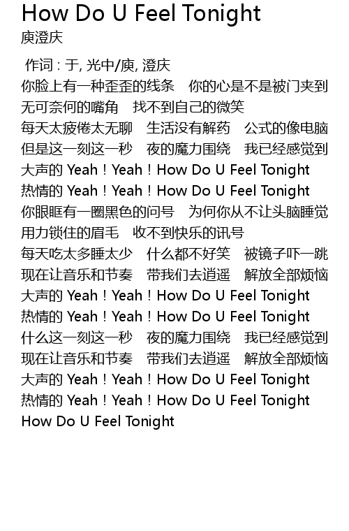 | [02:13.31] | dà shēng de Yeah! Yeah! How Do U Feel Tonight |