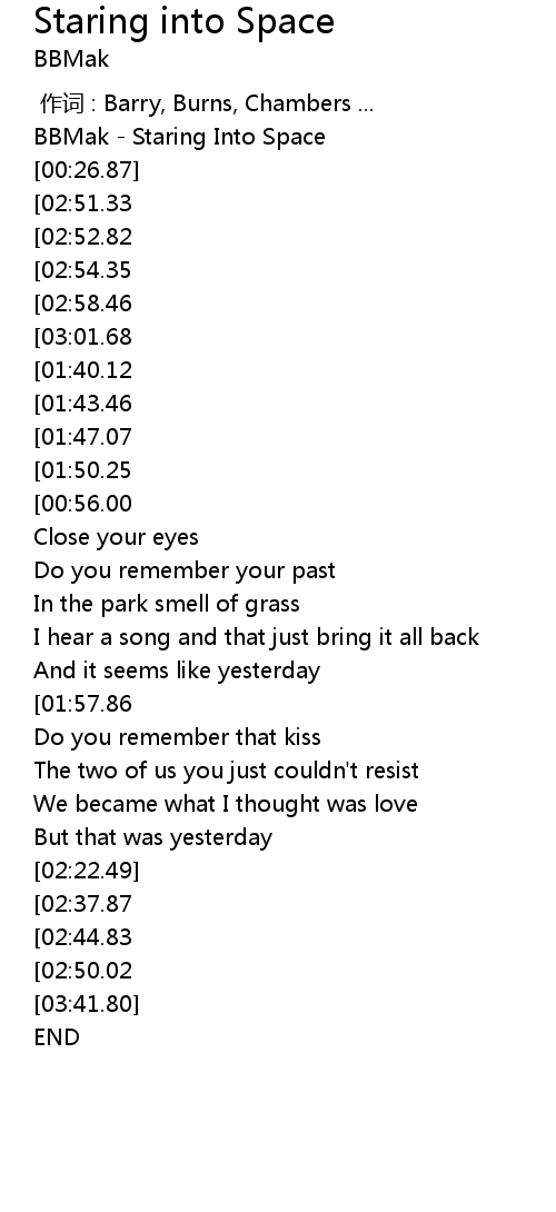 | [00:00.00] | BBMak - Staring Into Space |