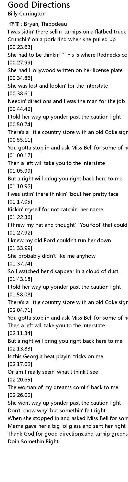 | [02:28.77] | Thank God for good directions:and turnip greens |