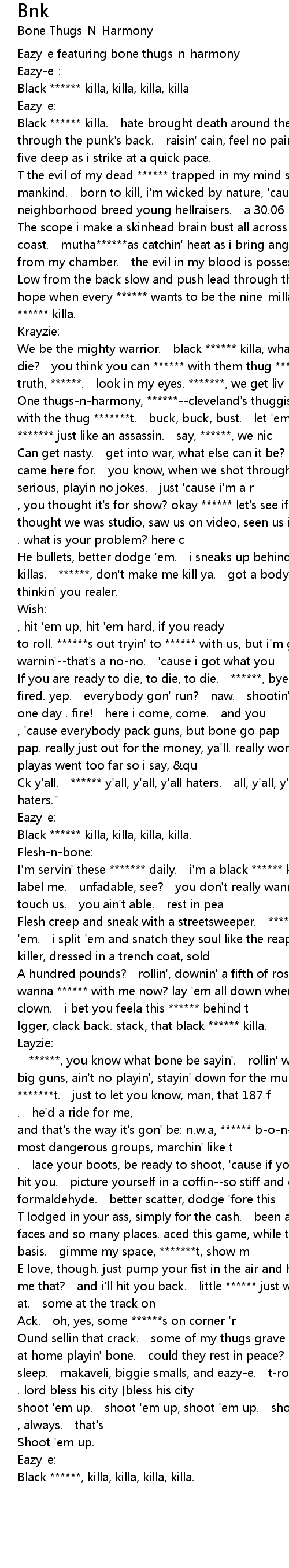| Aler. we black killas and down to ride for e e. he' d a ride for me, and that' s the way it' s gon' be: n. w. a, bone. all around the world, most dangerous groups, marchin' like t | |