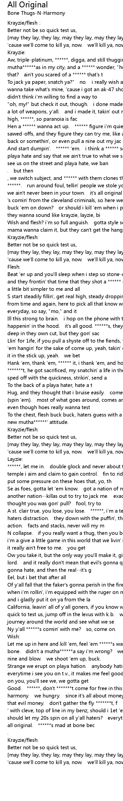 | ' with cleve, top of line in my benz, should i 1et 'em spin on all of y'all, should let my 20s spin on all y'all haters? everything we write, i swear, it's all original. ******s mad at bone bec | |
