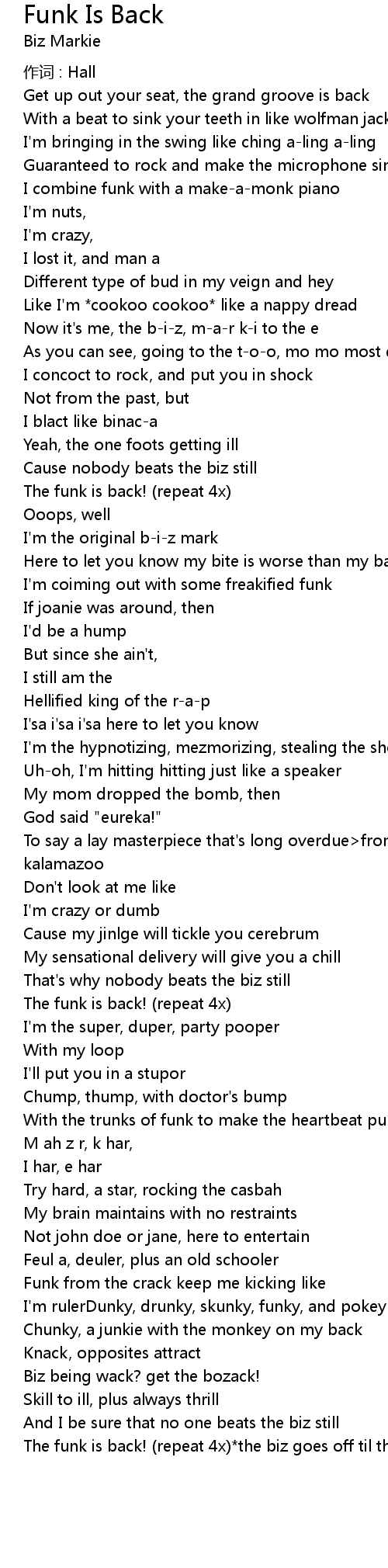 | The funk is back! repeat 4x the biz goes off til the song' s end |