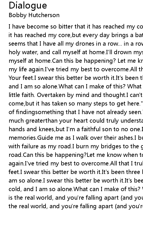 I have become so bitter that it has reached my core.I have become so bitter that it has reached my core,but every day brings a battle that I can't win.Still it seems that I have all my drones in a row... in a row.So I will drown myself in holy water, and call myself at home.I'll drown myself in holy water, and call myself at home.Can this be happening? Let me know when to feel,and when to live my life again.I've tried my best to overcome.All that I truly have I will lay at Your feet.I swear this better be worth it.It's been three hundred days of cold, and I am so alone.What can I make of this? What can I make of this?Oh me of little faith. Overtaken by mind and thought.I can't believe how far I've come,but it has taken so many steps to get here.""You speak your doubts in hope of findingsomething that I have not already seen.There are things that are so much greaterthan your heart could truly understand.""You've got me out on my hands and knees,but I'm a faithful son to no one.I bury loved ones in memories.Guide me as I walk over their ashes.I burn my bridges to the ground with failure as my road.I burn my bridges to the ground with failure as my road.Can this be happening?Let me know when to feel, and when to live my life again.I've tried my best to overcome.All that I truly have I will lay at Your feet.I swear this better be worth it.It's been three hundred days of cold, and I am so alone.I swear this better be worth it.It's been three hundred days of cold, and I am so alone.What can I make of this? What can I make of this?""This is the real world, and you're falling apart (and you're falling apart).This is the real world, and you're falling apart (and you're falling apart).