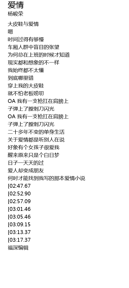 | [03:38.04][03:05.46] | 穿上大皮鞋寻找那个爱情 |