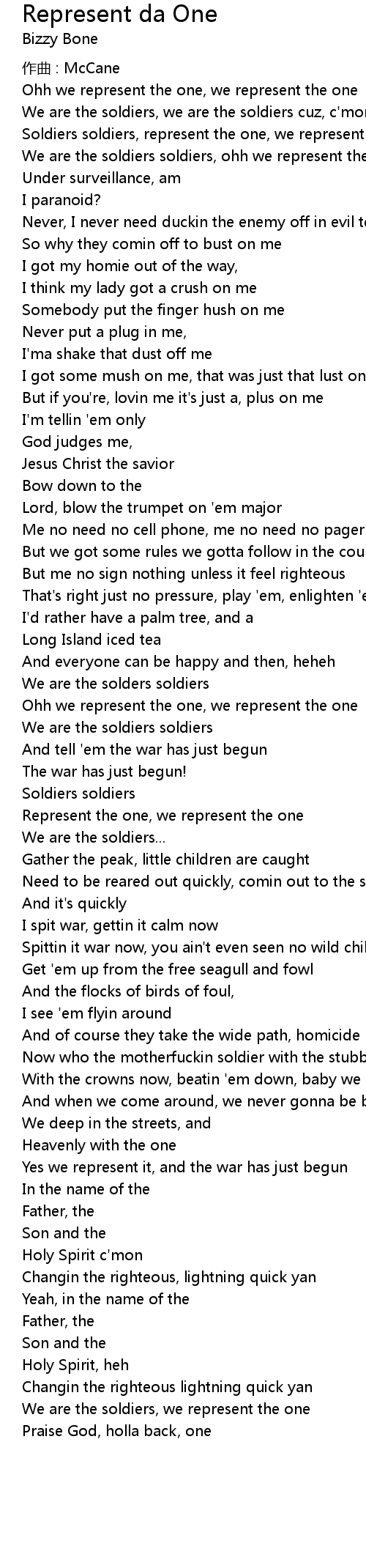 | We are the soldiers soldiers, ohh we represent the one | |