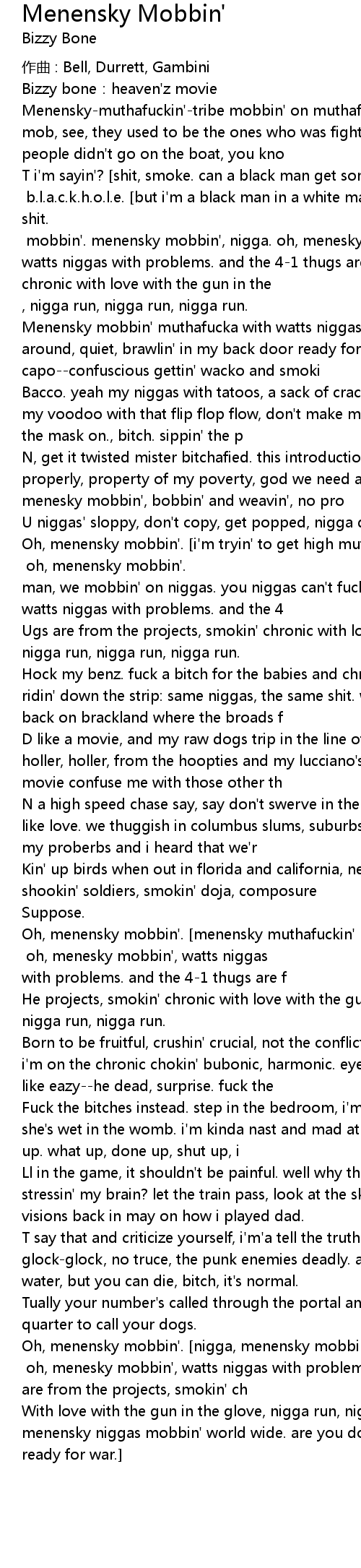 | Oh, menensky mobbin'. [nigga, menensky mobbin' world-muthafuckin'-wide on these hoes. c'mon!] oh, menesky mobbin', watts niggas with problems. and the 4-1 thugs are from the projects, smokin' ch | |