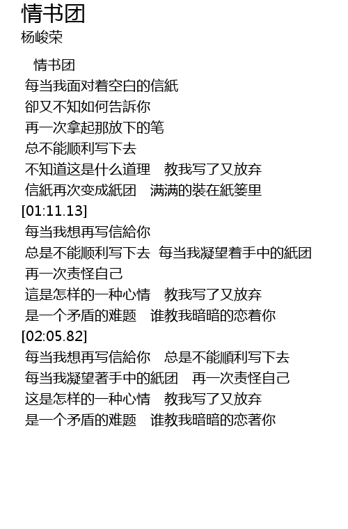 | [02:49.86] | měi dāng wǒ xiǎng zài xiě xìn gěi nǐ zǒng shì bù néng shùn lì xiě xià qù |