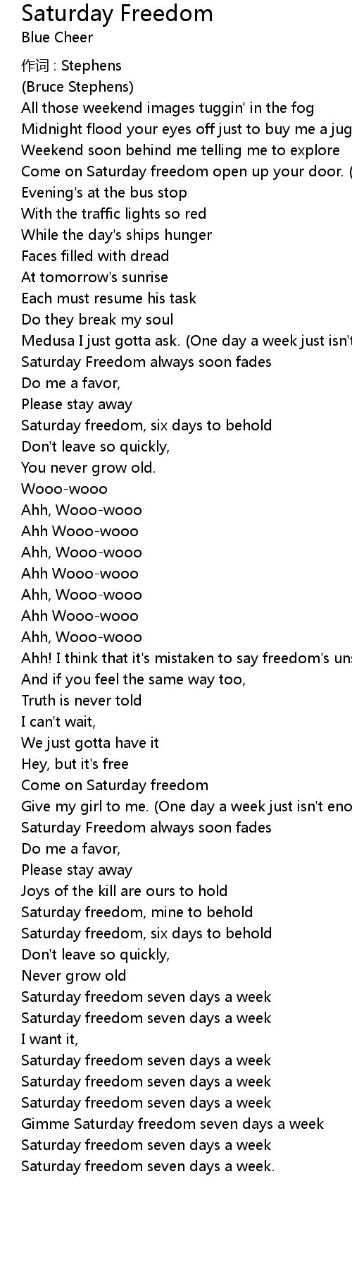 | Come on Saturday freedom open up your door. One day a week just isn' t enough. | |
