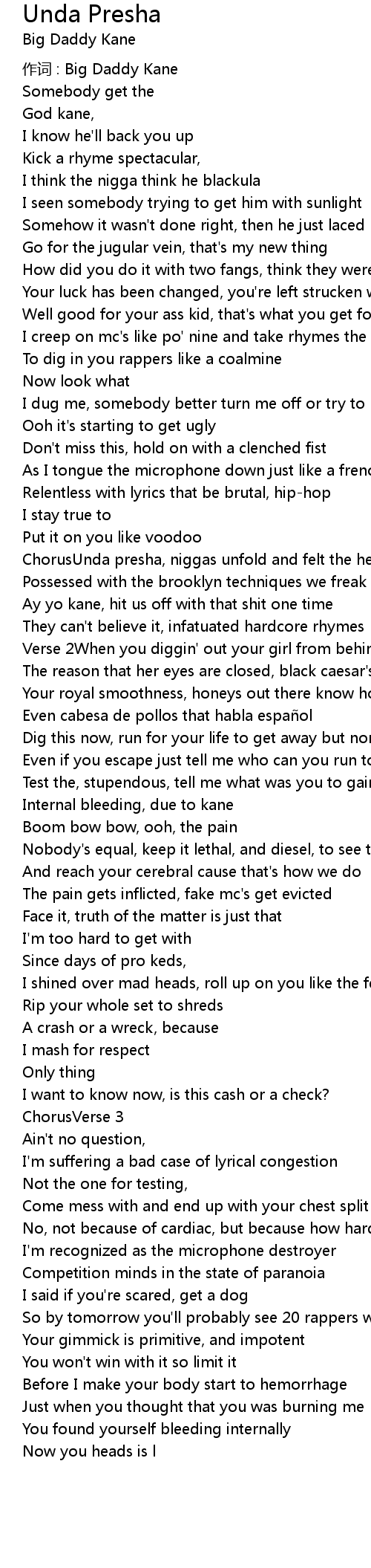 | I creep on mc's like po' nine and take rhymes the whole nine | |
