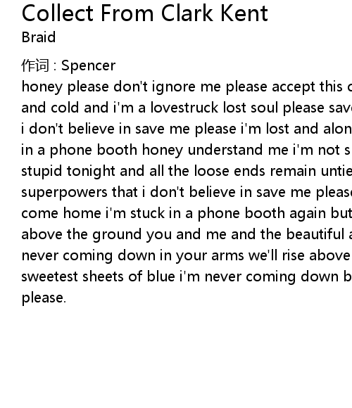 | honey please don' t ignore me please accept this call i' m on the corner of cough and cold and i' m a lovestruck lost soul please save me from the superpowers that i don' t believe in save me please i' m lost and alone i can' t come home i' m stuck in a phone booth honey understand me i' m not sure to fly in fact i' m super stupid tonight and all the loose ends remain untied please save me from the superpowers that i don' t believe in save me please i' m lost and alone i can' t come home i' m stuck in a phone booth again but once in your arms we' ll rise above the ground you and me and the beautiful aerial view of sunrise city i' m never coming down in your arms we' ll rise above the clouds me and you in the sweetest sheets of blue i' m never coming down but come and pick me up first please. |