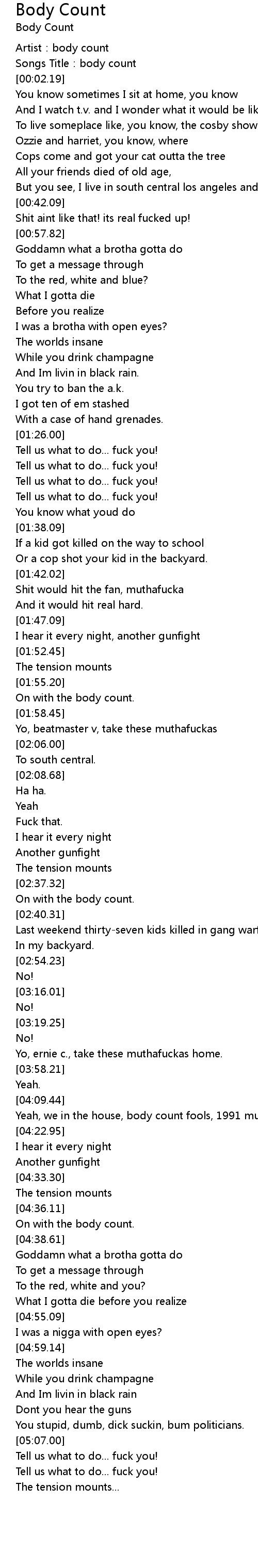 | [00:01.01] | Songs Title:body count |