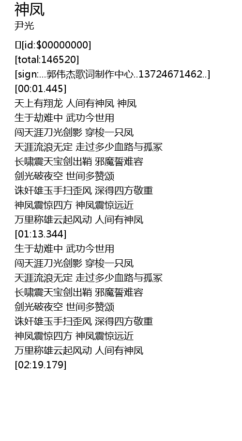 | [01:01.200] | 神凤震惊四方 神凤震惊远近 |