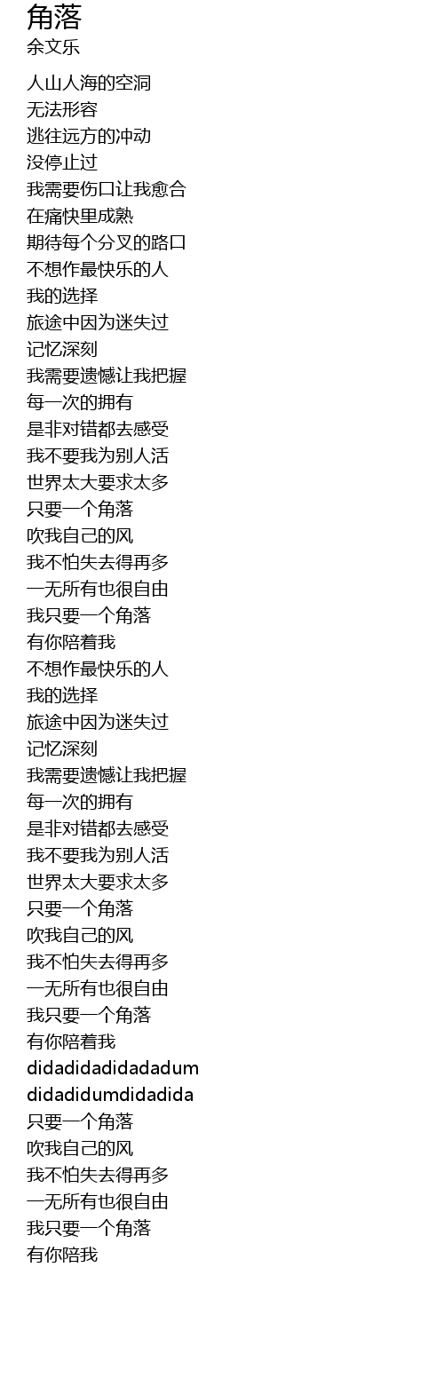 | [01:42.87] | wǒ zhǐ yào yí gè jiǎo luò |