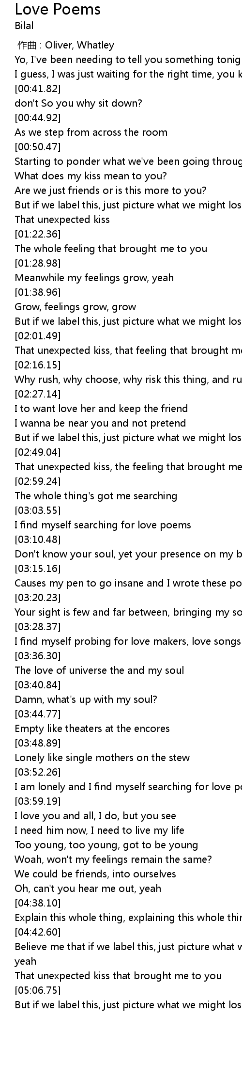 | [03:52.94] | I am lonely and I find myself searching for love poems |