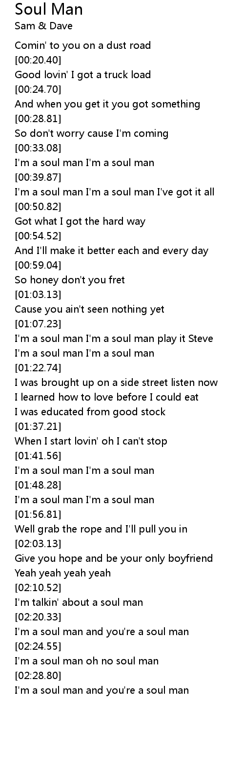 [01:08.30] I'm a soul man I'm a soul man play it Steve