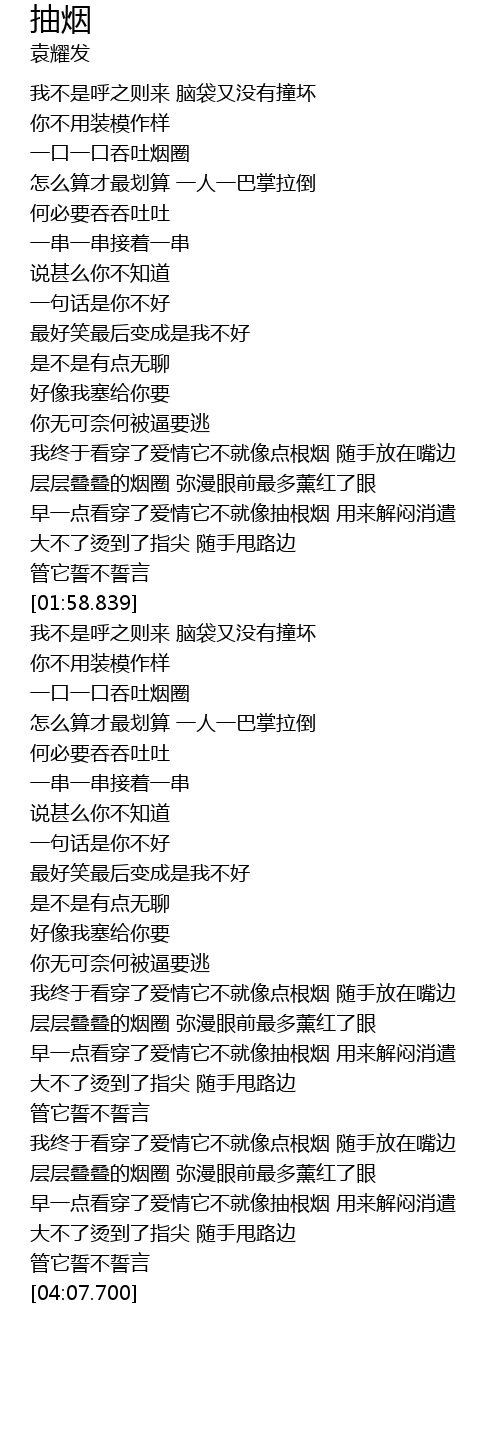 | [03:51.490] | zǎo yì diǎn kàn chuān le ài qíng tā bù jiù xiàng chōu gēn yān yòng lái jiě mèn xiāo qiǎn |