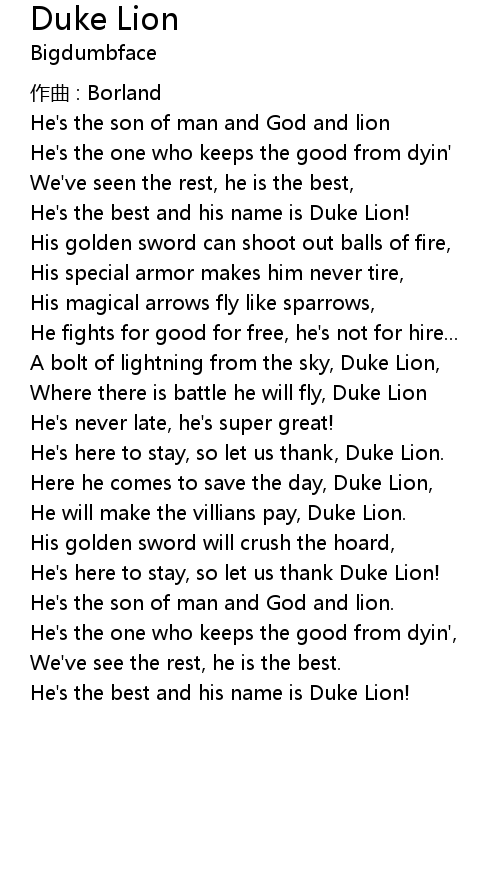 | He' s here to stay, so let us thank, Duke Lion. | |