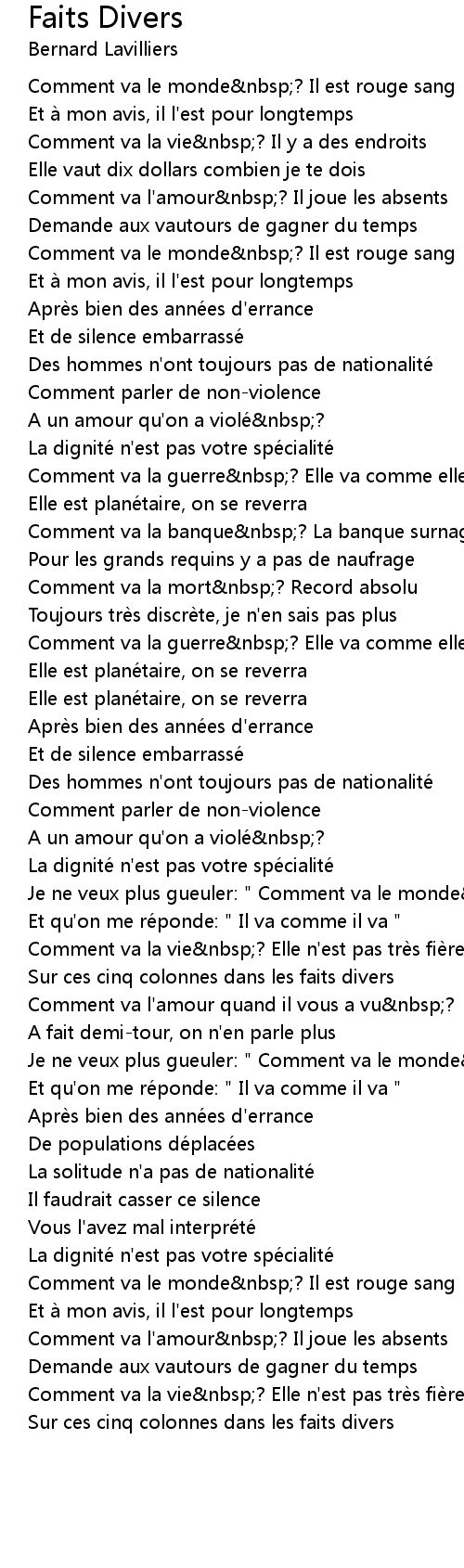| Je ne veux plus gueuler: " Comment va le monde nbsp? " | |