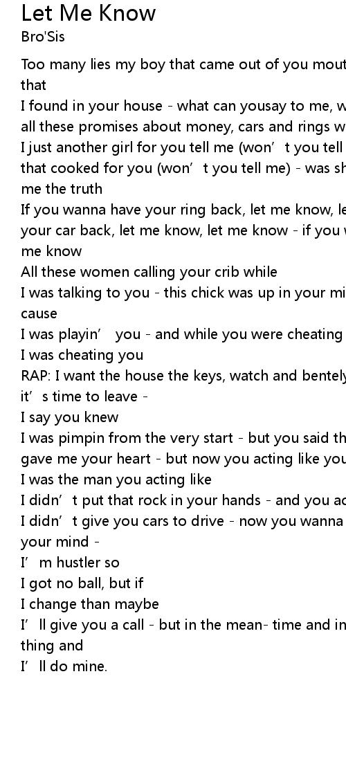 | If you wanna have your ring back, let me know, let me know - if you wanna have your car back, let me know, let me know - if you wanna have your rolly back, let me know | |