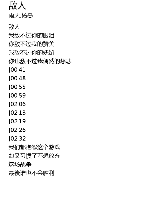 | [00:15] | 我敌不过你的眼泪 |