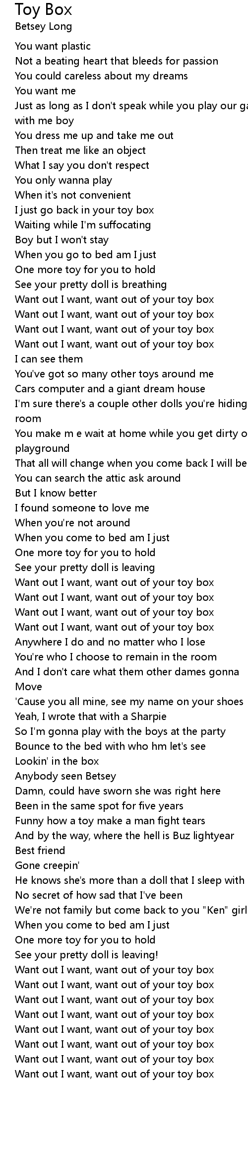Want out I want, want out of your toy box |