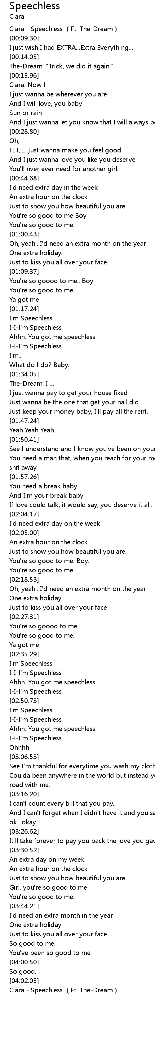 | [04:03.95] | Ciara - Speechless (Ft. The-Dream) |