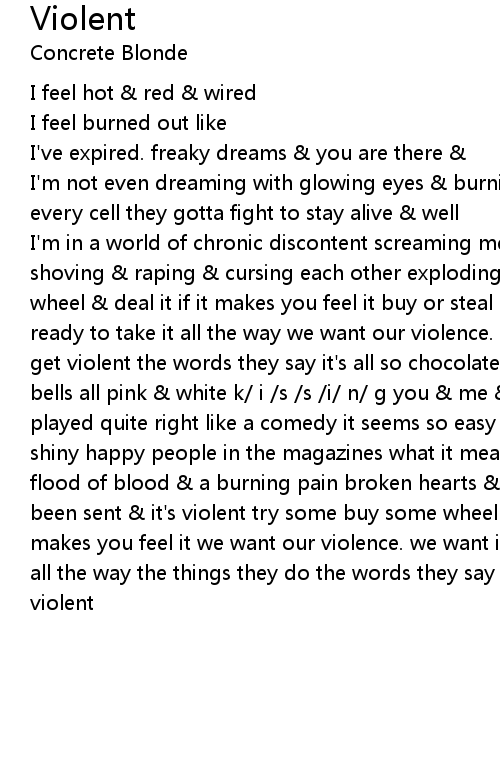 I'm in a world of chronic discontent screaming metal & burning rubber always shoving & raping & cursing each other exploding into violence. try some buy some wheel & deal it if it makes you feel it buy or steal it we want it intense get ready to take it all the way we want our violence. the things they do ready to get violent the words they say it's all so chocolates & candlelight wedding bells all pink & white k/ i /s /s /i/ n/ g you & me & we makes three that never played quite right like a comedy it seems so easy & it looks so clean, all the shiny happy people in the magazines what it meant. but nothing seems to mean a flood of blood & a burning pain broken hearts & throbbing brains the message has been sent & it's violent try some buy some wheel & deal it buy or steal it if it makes you feel it we want our violence. we want it intense get ready to take it all the way the things they do the words they say it's all so ready to get violent |