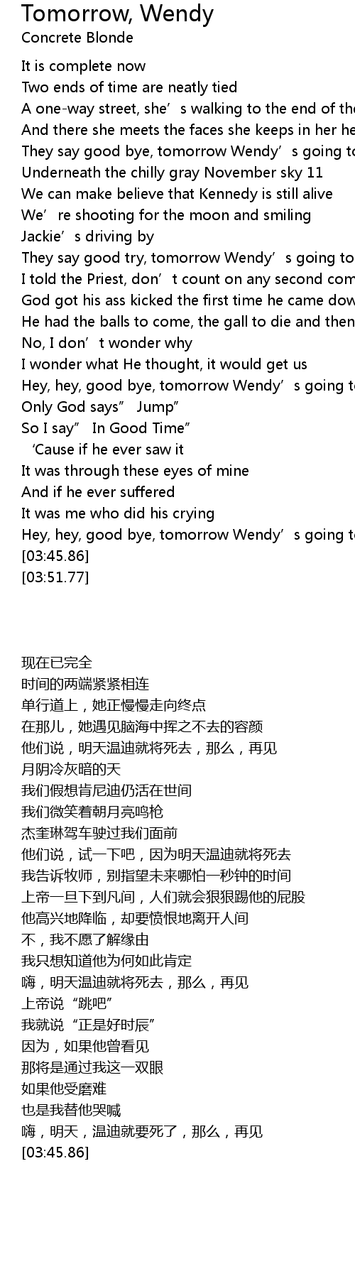 | [03:33.01] | 嗨,明天,温迪就要死了,那么,再见 |