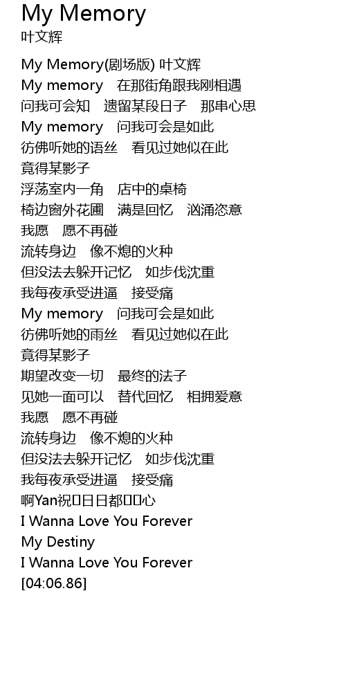 | [00:-0.01] | My Memory jù chǎng bǎn yè wén huī |