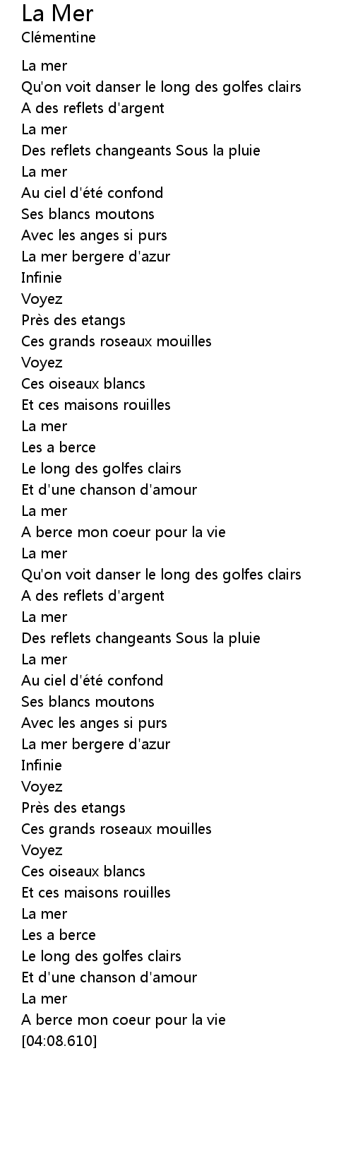 | [02:39.980] | Qu' on voit danser le long des golfes clairs |