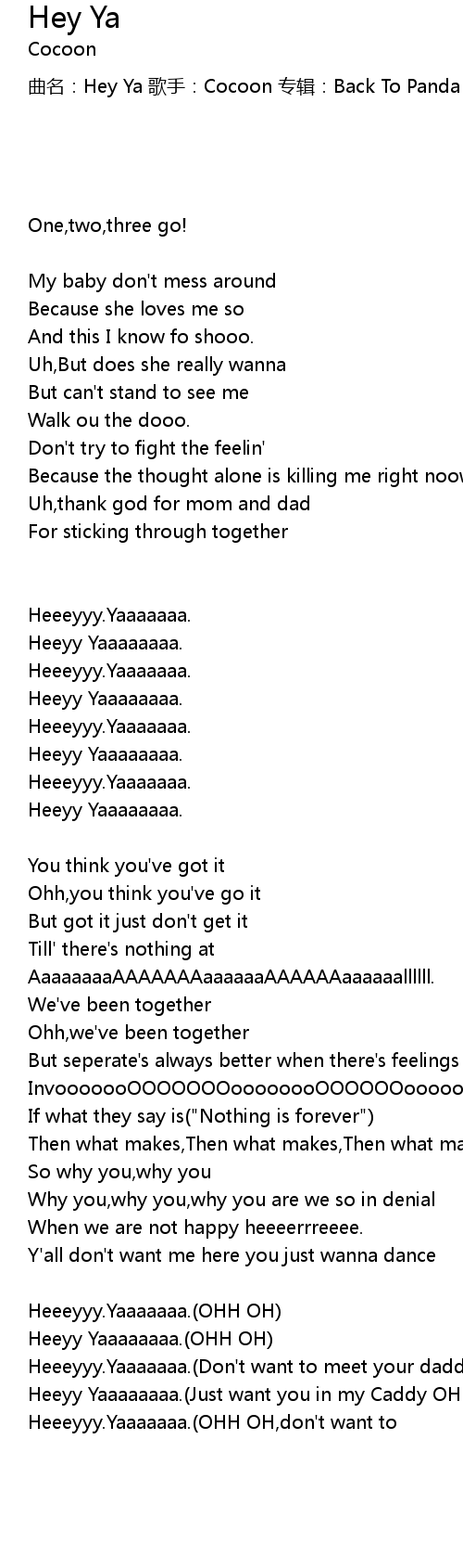 | 曲名:Hey Ya 歌手:Cocoon 专辑:Back To Panda Mountains | |