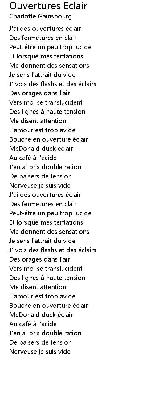 | [01:24.18] | J' vois des flashs et des éclairs |