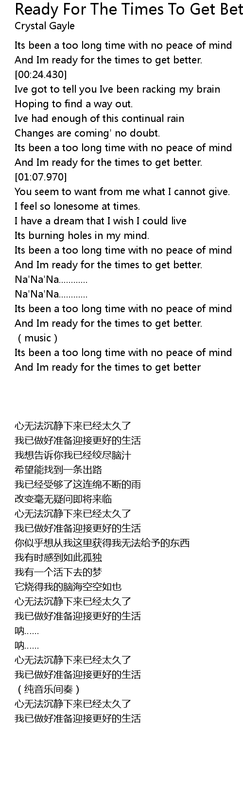 | [01:31.600] | Its been a too long time with no peace of mind |