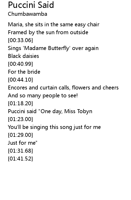 | [00:34.06] | Sings 'Madame Butterfly' over again |