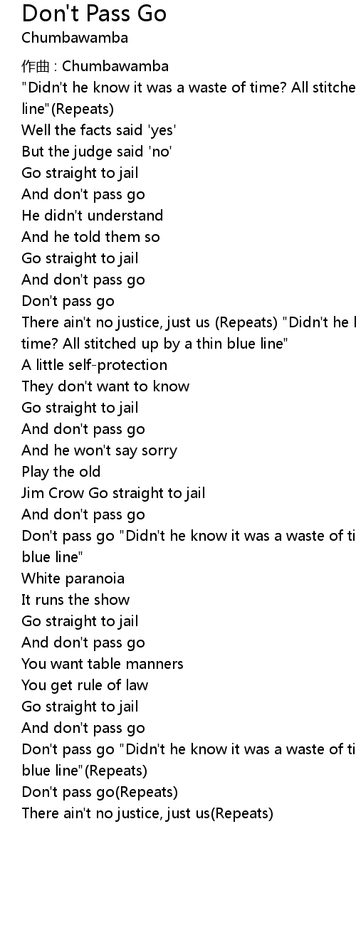 | Don't pass go "Didn't he know it was a waste of time? All stitched up by a thin blue line"(Repeats) | |