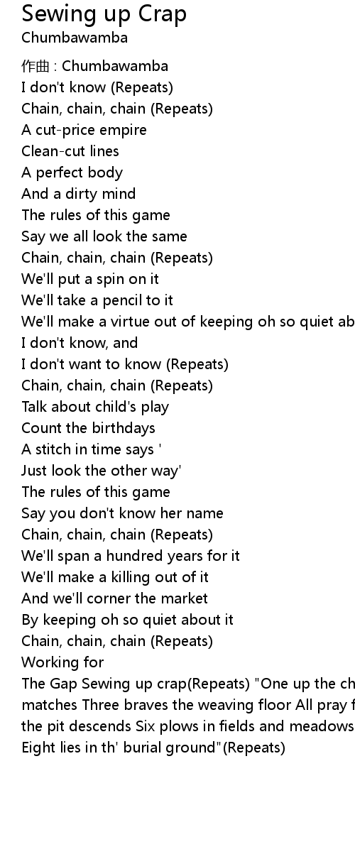 | The Gap Sewing up crap(Repeats) "One up the chimney goes Two hawks a tray of matches Three braves the weaving floor All pray for the life of Four Five down the pit descends Six plows in fields and meadows Seven spins the handloom round Eight lies in th' burial ground"(Repeats) |